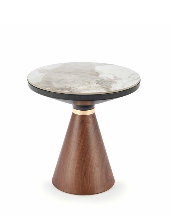 Podstawa stolika jest wykonana z metalu w ciepłym, orzechowym odcieniu, co nadaje mu elegancji i charakteru. Metalowa konstrukcja jest solidna i trwała, zapewniając stabilność całemu stolikowi.