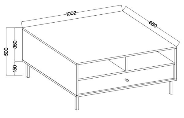 Stolik został wyposażony w pojemną szufladę na prowadnicach kulkowych oraz otwarte półki, które pozwalają na wygodne przechowywanie pilotów, czasopism czy drobnych akcesoriów.