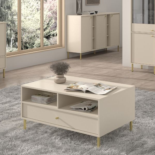 Stolik kawowy Tokyo 2 w kolorze piaskowego beżu to połączenie nowoczesnego stylu i codziennej funkcjonalności.