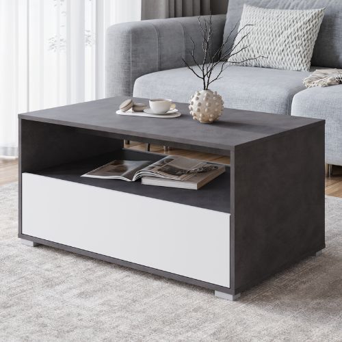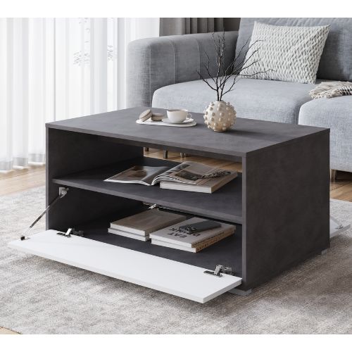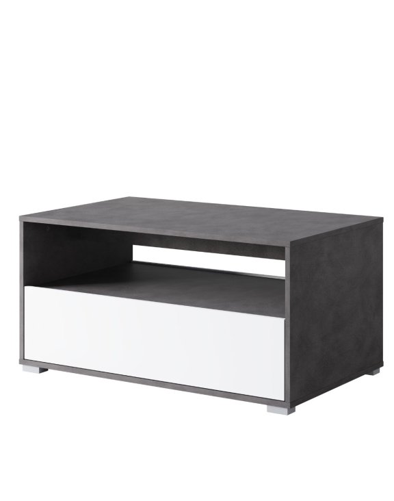 Stolik charakteryzuje się prostą, geometryczną bryłą w eleganckim kolorze matera, który został przełamany białymi frontami, tworząc nowoczesne i ponadczasowe połączenie, doskonale odnajdujące się w salonach urządzonych w stylu nowoczesnym, minimalistycznym czy industrialnym.