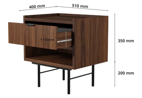 Praktyczne wymiary – dzięki kompaktowej budowie stolik bez trudu zmieści się nawet w mniejszych sypialniach, oferując jednocześnie dużą funkcjonalność.