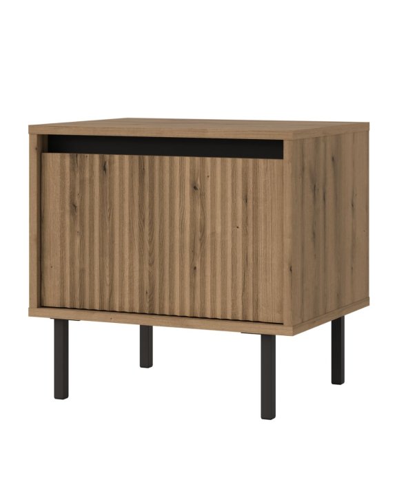 Stolik nocny Osaka doskonale prezentuje się zarówno jako pojedynczy mebel, jak i w duecie po obu stronach łóżka, tworząc spójną i harmonijną przestrzeń wypoczynkową.