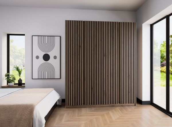 Nowoczesna i wyjątkowo pojemna szafa Kaja to idealne połączenie naturalnej estetyki drewna z elegancką czernią.