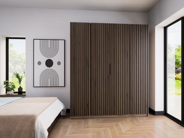 Nowoczesna i wyjątkowo pojemna szafa Kaja to idealne połączenie naturalnej estetyki drewna z elegancką czernią.
