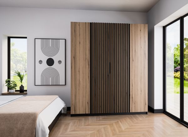 Nowoczesna i wyjątkowo pojemna szafa Kaja to idealne połączenie naturalnej estetyki z elegancką czernią.