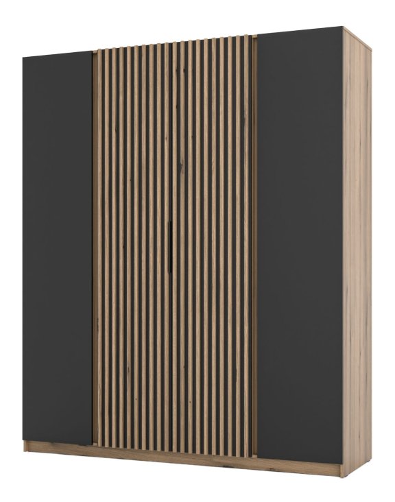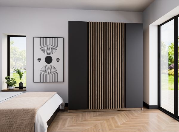 Nowoczesny design – korpus w kolorze czarnym, drzwi środkowe lamele w kolorze dąb Evoke, drzwi zewnętrzne czarne