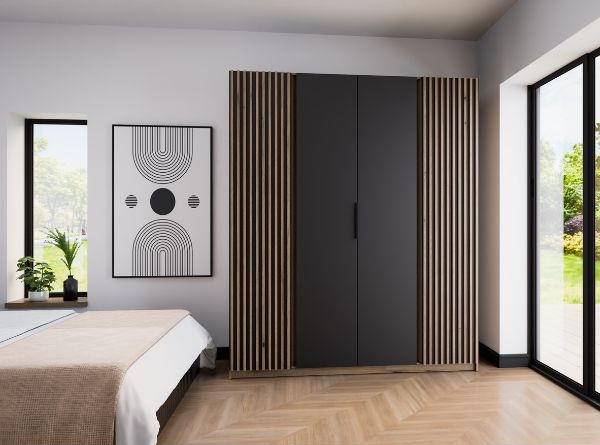 Nowoczesna i wyjątkowo pojemna szafa Kaja to idealne połączenie naturalnej estetyki z elegancką czernią.