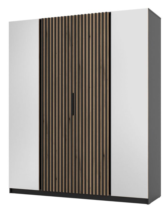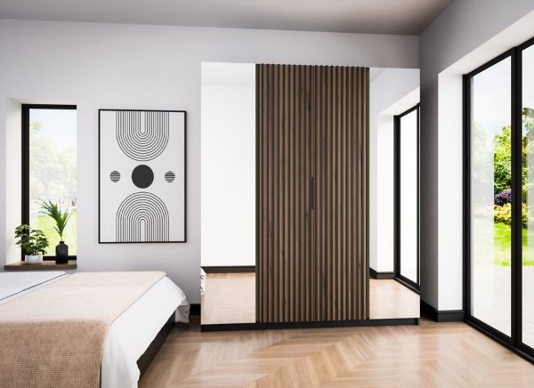 Nowoczesny design – korpus w kolorze czarnym, drzwi środkowe dąb Evoke, czarne lamele, drzwi zewnętrzne lustra