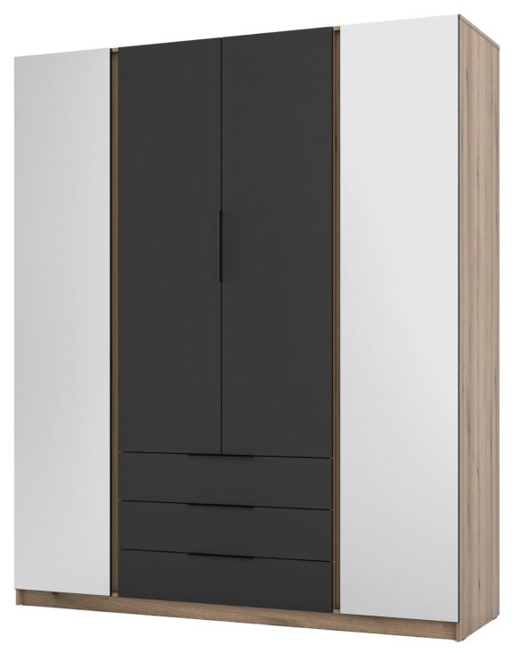 Połączenie naturalnego dekoru z elegancką czernią oraz dużymi lustrami na bocznych drzwiach sprawia, że mebel nie tylko zapewnia dużo miejsca do przechowywania, ale także optycznie powiększa i rozjaśnia wnętrze.