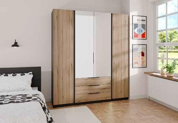 Połączenie naturalnego dekoru dąb Evoke z elegancką czernią oraz dużymi lustrami na drzwiach sprawia, że mebel nie tylko zapewnia dużo miejsca do przechowywania, ale także optycznie powiększa i rozjaśnia wnętrze.