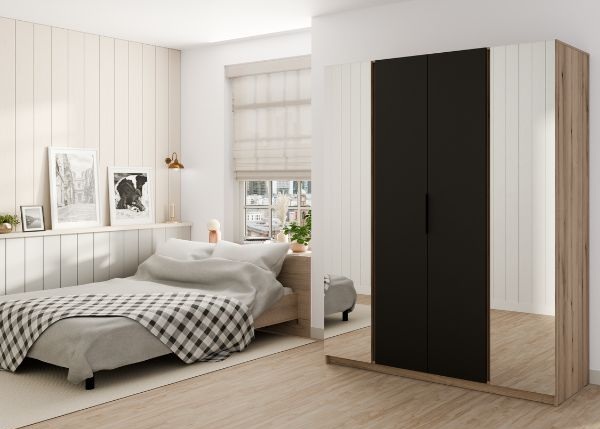 Nowoczesny design – korpus w kolorze dąb Evoke, drzwi boczne lustra, drzwi środkowe czarne