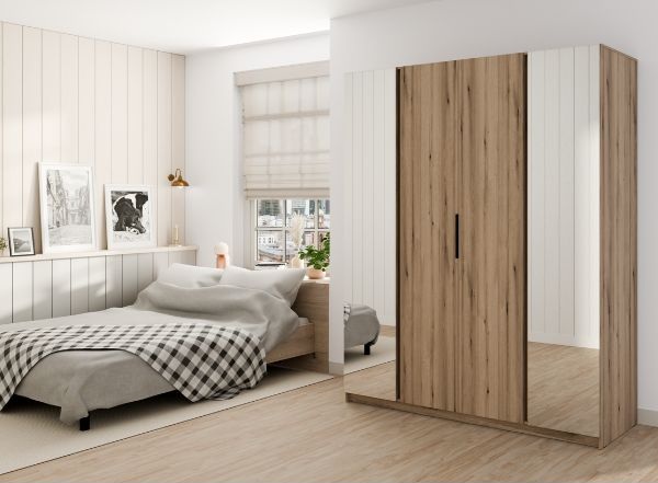 Nowoczesny design – korpus i środkowe drzwi w kolorze dąb Evoke, drzwi boczne lustra