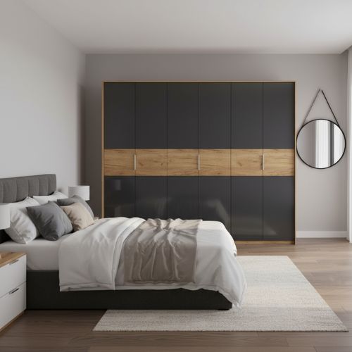 Połączenie ciemnego grafitu z ciepłym odcieniem dębu sprawia, że mebel staje się wyrazistą ozdobą każdego pomieszczenia — od przedpokoju, przez sypialnię, aż po garderobę.