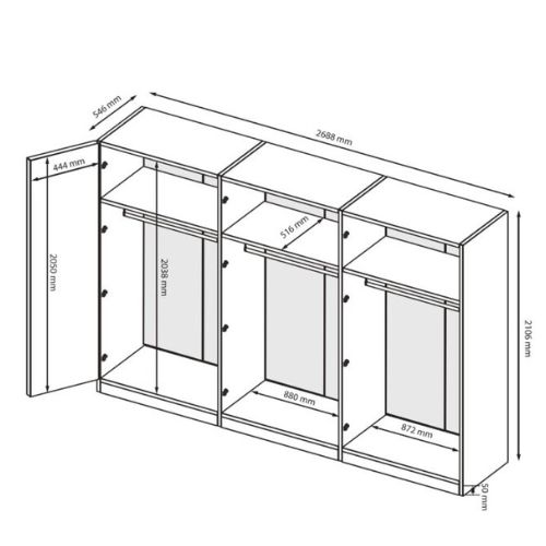 Wnętrze szafy zaprojektowano z wyjątkową dbałością o wygodę użytkowania. Trzy szerokie moduły zapewniają ogrom miejsca do przechowywania różnych typów garderoby. Wysokie przestrzenie z drążkami umożliwiają przechowywanie dłuższych ubrań, takich jak płaszcze, sukienki czy marynarki, bez obawy o ich zagniecenie.