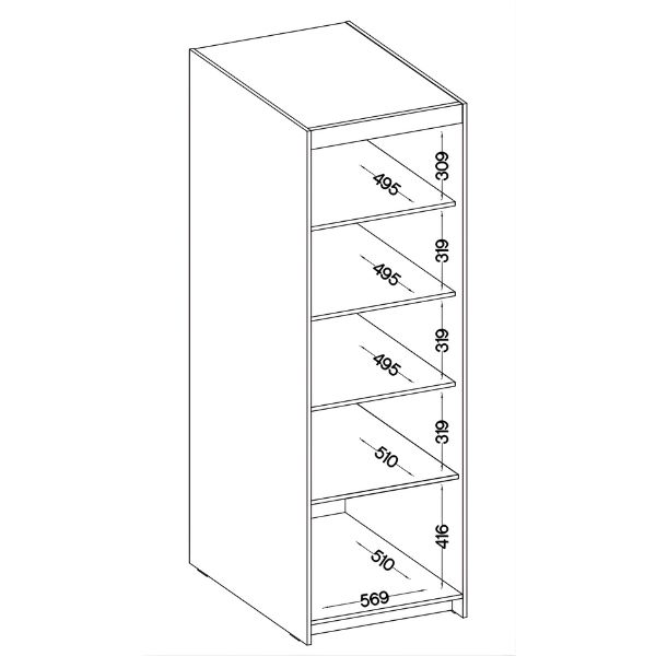 Wnętrze szafy kryje praktyczne półki, które pomieszczą ubrania, akcesoria lub dokumenty, a trzy pojemne szuflady pozwolą uporządkować drobiazgi, bieliznę lub tekstylia.