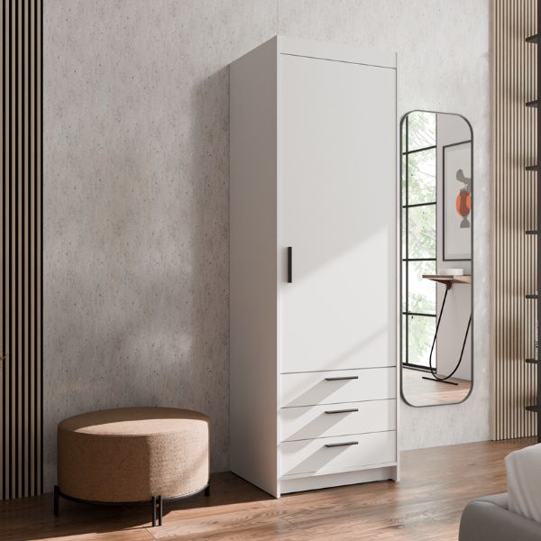 Funkcjonalność w kompaktowej formie – szafa Elena 1D3S WH01 to idealne rozwiązanie do małych przestrzeni, gdzie liczy się porządek, estetyka i wygoda użytkowania.