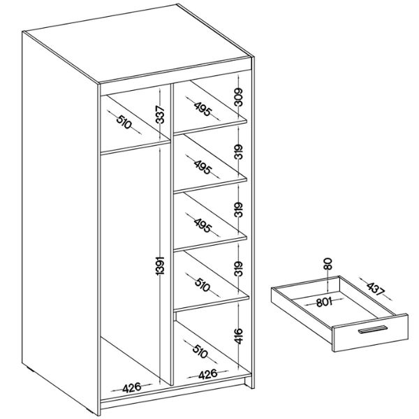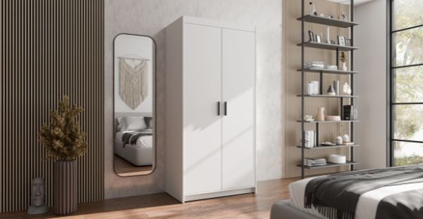 Dzięki pojemnemu wnętrzu z półkami i drążkiem na ubrania, szafa Elena 2D WH02 pomoże Ci utrzymać porządek i harmonię w sypialni, przedpokoju lub pokoju młodzieżowym.