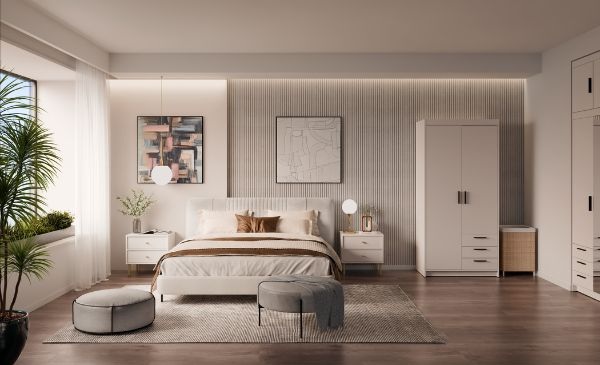 Nowoczesna szafa dwudrzwiowa w kolorze beżu piaskowego to idealne połączenie naturalnego wyglądu drewna z funkcjonalnością, której oczekujesz od codziennego mebla do przechowywania.