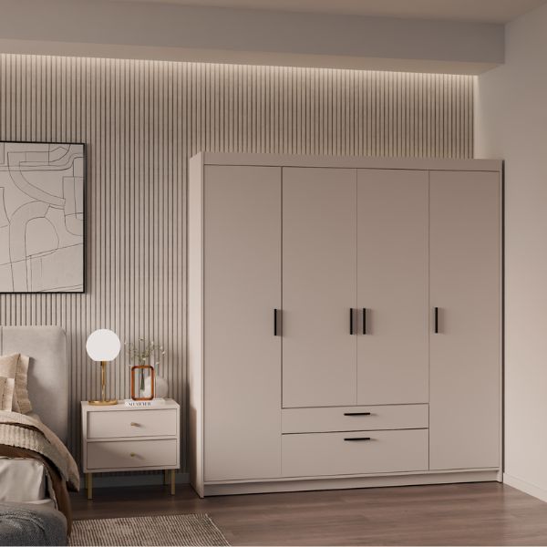 Dzięki swojej symetrycznej formie i jasnej kolorystyce, szafa Elena 4D2S doskonale wpasuje się w sypialnię, garderobę lub przedpokój, nadając pomieszczeniu lekkości i elegancji.