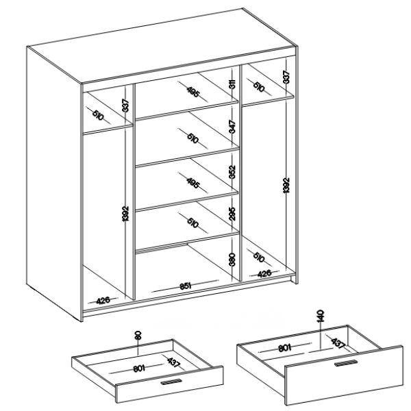Przemyślane wnętrze szafy oferuje dwie przestrzenie z drążkami na ubrania wiszące oraz funkcjonalny układ półek, które pomieszczą odzież codzienną, pościel czy akcesoria.