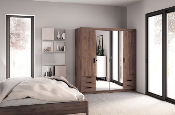 Odkryj harmonię między nowoczesnym stylem a praktycznym przechowywaniem dzięki szafie Elena 4D6S w kolorze dąb lefkas z lustrem.