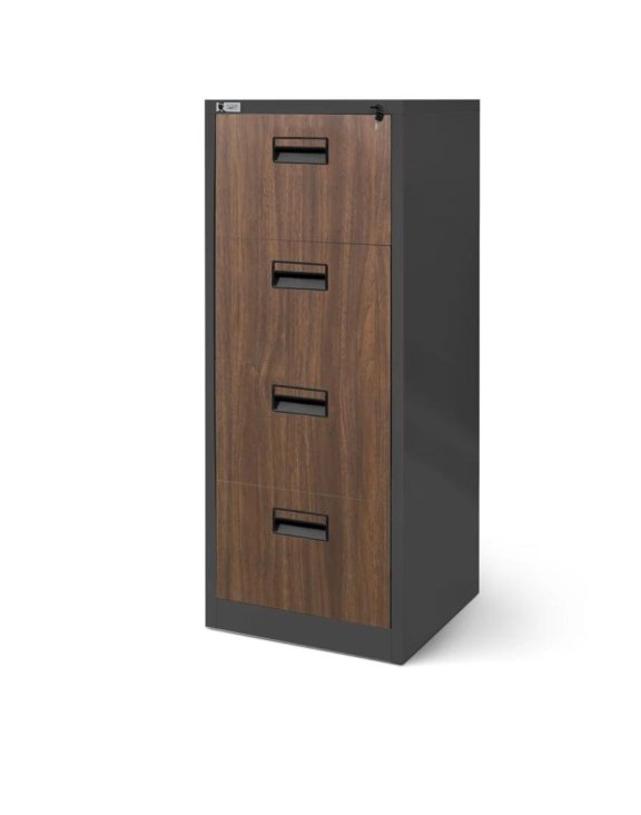 Szafa kartotekowa Sara w kolorze antracytowo-orzechowym z czterema szufladami, to kompaktowym