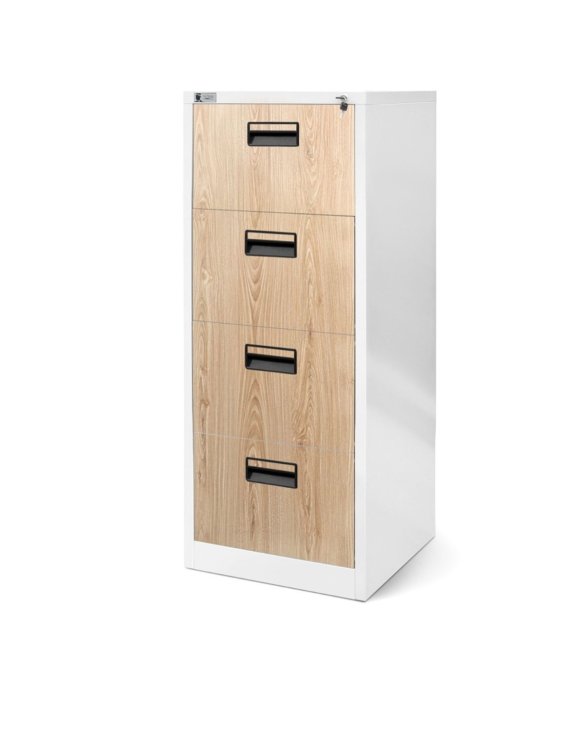 Szafa kartotekowa Sara z czterema szufladami w białym kolorze z wstawkami dąb sonoma, to kompaktowym