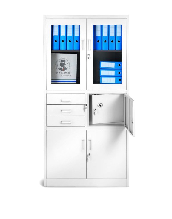 Szafa metalowa Filip z sejfem w kolorze białym, to mebel spełniający najróżniejsze potrzeby różnych odbiorców.
