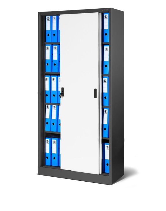 Szafa metalowa z przesuwnymi drzwiami KUBA marki Jan Nowak w kolorze antracytowo-białym stanie się uzupełnieniem większości wnętrz biurowych, zapewniając maksymalny komfort użytkowania.