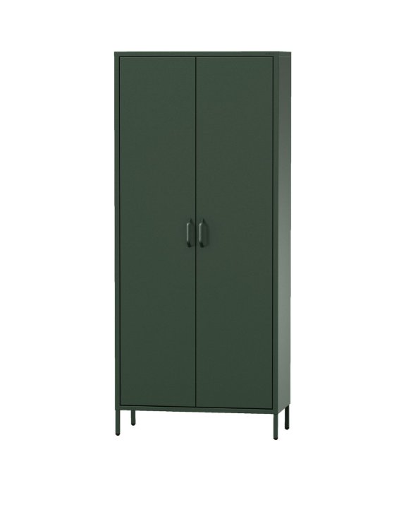 Dwudrzwiowa metalowa szafa na nóżkach w kolorze butelkowej zieleni marki Jan Nowak zachwyca wyglądem i pojemnością.