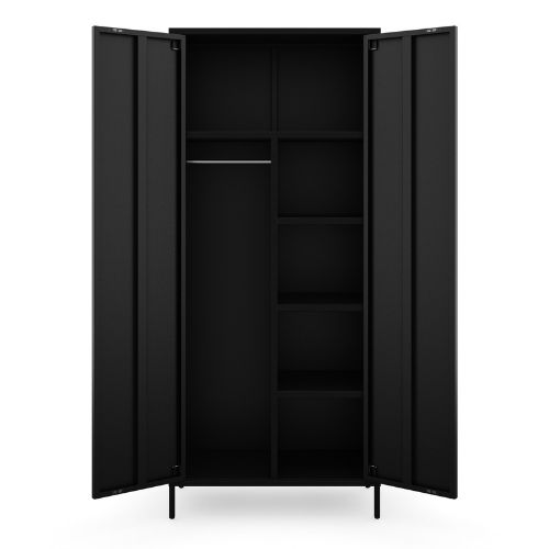 Dwudrzwiowa metalowa szafa na nóżkach w kolorze czarnym marki Jan Nowak zachwyca wyglądem i pojemnością.