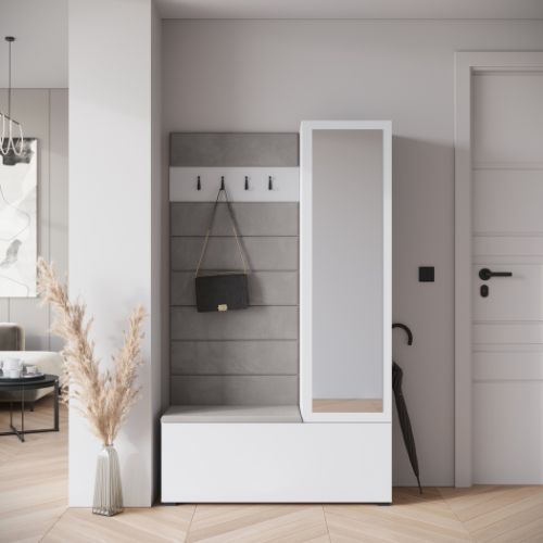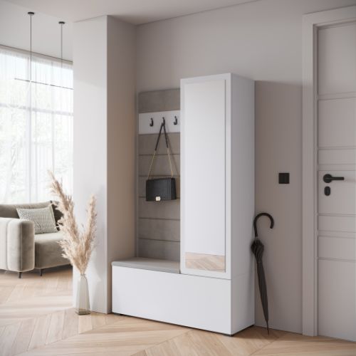 Wnętrze mebla jest imponujące. Model wyposażony w wysoką, zamykaną szafę z drzwiami frontowymi, za którymi ukryto funkcjonalny układ półek, idealny do przechowywania butów, torebek, koszy z dodatkami, czapek, szalików czy rękawiczek.