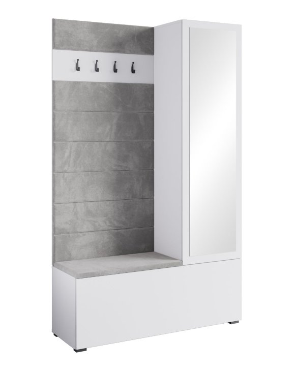 Środkowa, otwarta część zestawu stanowi strefę codziennego użytkowania. Znajdują się tu cztery solidne haczyki na ubrania, na których można wygodnie powiesić płaszcz czy kurtkę. Całość uzupełnia miękkie siedzisko i oparcie tapicerowane tkaniną (Mono 244), utrzymane w odcieniu szarości.