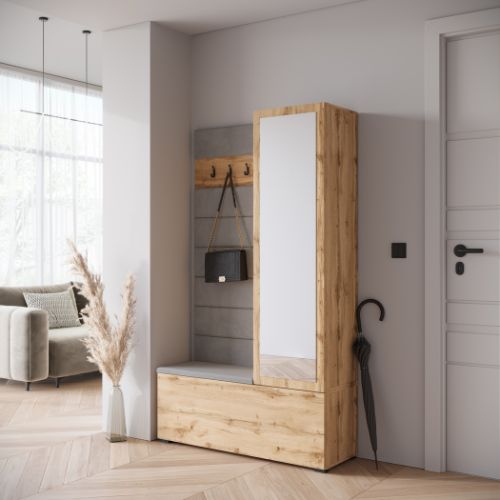 Garderoba z siedziskiem utrzymana jest w kolorze dąb wotan, co nadaje przestrzeni elegancji.