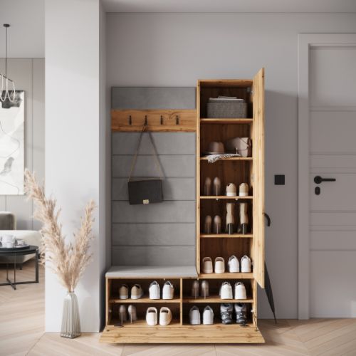 Pod siedziskiem umieszczono półki na obuwie, które umożliwiają szybki dostęp do najczęściej używanych par butów.