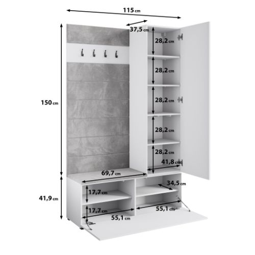 Wnętrze mebla jest imponujące. Model wyposażony w wysoką, zamykaną szafę z drzwiami frontowymi, za którymi ukryto funkcjonalny układ półek, idealny do przechowywania butów, torebek, koszy z dodatkami, czapek, szalików czy rękawiczek.