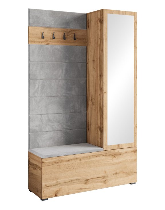 Środkowa, otwarta część zestawu stanowi strefę codziennego użytkowania. Znajdują się tu cztery solidne haczyki na ubrania, na których można wygodnie powiesić płaszcz czy kurtkę. Całość uzupełnia miękkie siedzisko i oparcie tapicerowane tkaniną (Mono 244), utrzymane w odcieniu szarości.
