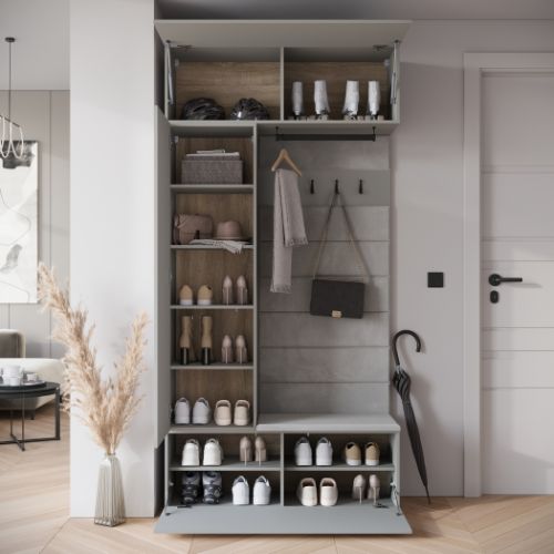 Pod siedziskiem umieszczono półki na obuwie, które umożliwiają szybki dostęp do najczęściej używanych par butów.
