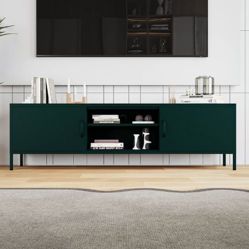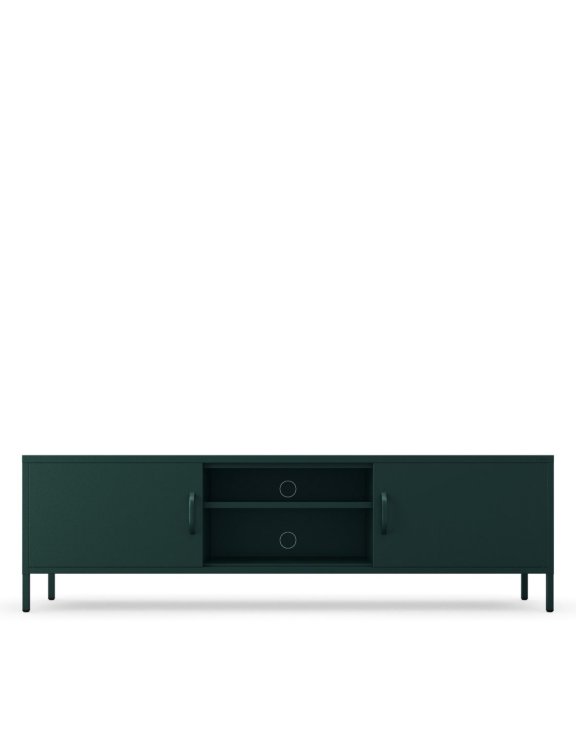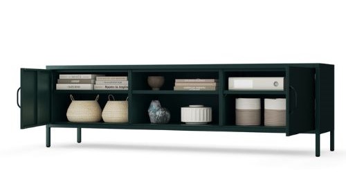 Szafka metalowa pod telewizor prezentuje się niezwykle elegancko w kolorze butelkowej zieleni.