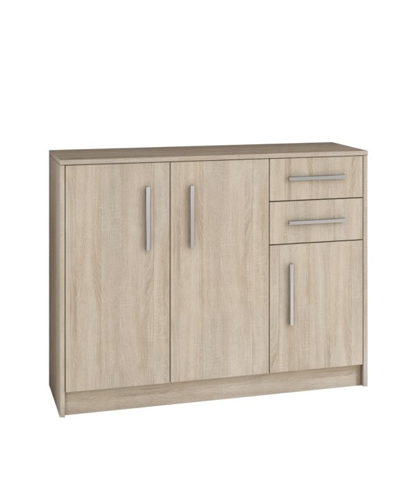 Szafka wyposażona jest w trzy tradycyjnie otwierane schowki oraz dwie funkcjonalne szuflady, co umożliwia łatwe i uporządkowane przechowywanie obuwia oraz akcesoriów.