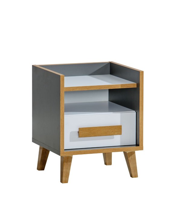 Połączenie głębokiej szarości, matowej bieli i elementów z naturalnego drewna tworzy harmonijną, nowoczesną kompozycję, która świetnie odnajdzie się zarówno w skandynawskich, minimalistycznych, jak i bardziej klasycznych wnętrzach. Geometryczna forma i lekko skośne nóżki nadają meblowi lekkości i charakteru.
