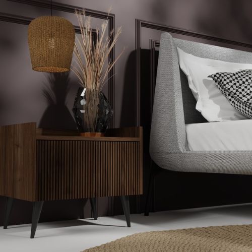 Wybarwienie orzechowe nadaje meblowi szlachetny charakter i podkreśla strukturę drewna. Front szafki został zaprojektowany w formie pionowych ryflowań, które nie tylko przyciągają wzrok, ale także dodają głębi i tekstury całej bryle. To subtelny detal, który czyni model Ademo wyjątkowym elementem wystroju sypialni.