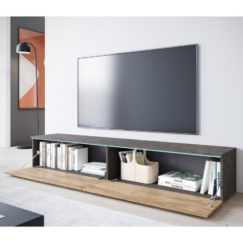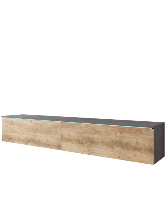 Dwie pojemne klapy otwierane ku dołowi kryją wewnątrz szerokie komory (każda o długości 87,65 cm), które pomieszczą sprzęt RTV, konsole, dekodery czy kolekcję płyt. Wysokość wnętrza 30 cm pozwala na wygodne rozmieszczenie akcesoriów, a szerokość całkowita 180 cm sprawia, że mebel doskonale sprawdzi się pod dużym telewizorem.
