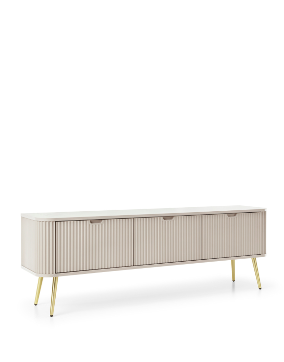 Szafka RTV Zova (RTV168) marki Piaski to stylowy i nowoczesny mebel o eleganckim designie w kolorze kaszmiru ze złotymi nogami.