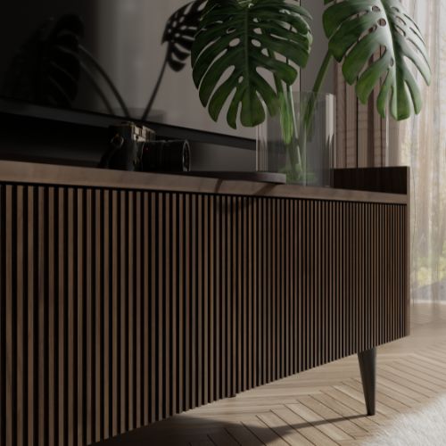 W tym modelu wszystko jest przemyślane. Prosta, minimalistyczna bryła została uzupełniona o dekoracyjny detal w postaci pionowego frezowania, które nadaje frontom głębi i wyrazistości. Ciepły odcień drewna wprowadza do wnętrza przytulność, a czarne, smukłe, metalowe nóżki dodają całości lekkości i nowoczesnego charakteru.