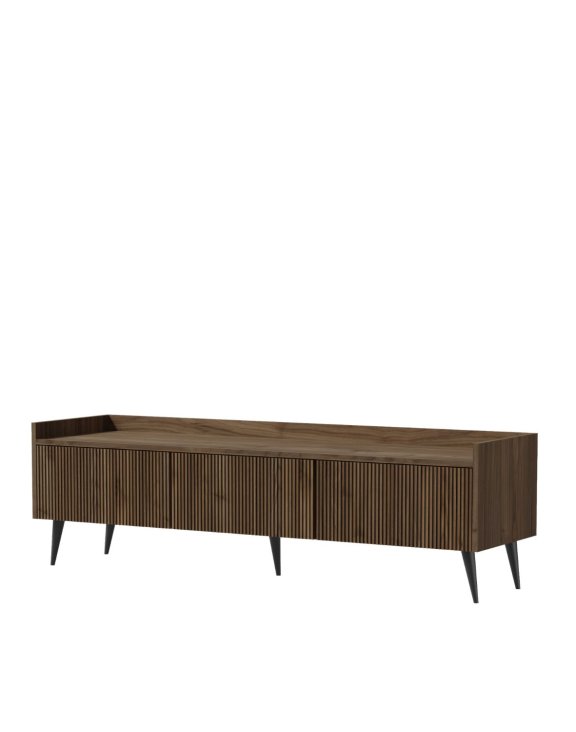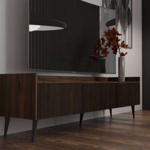 Szafka RTV 150 cm w kolorze orzech nadaje przestrzeni elegancji i harmonii, a charakterystyczne frezowane fronty przyciągają uwagę w subtelny, nienachalny sposób. To mebel, który nie dominuje aranżacji, ale doskonale ją dopełnia.