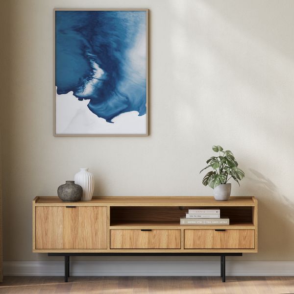 - Funkcjonalny układ – szafka posiada zamykaną szafkę boczną, dwie pojemne szuflady oraz praktyczną otwartą półkę na dekodery, konsole czy sprzęt audio.