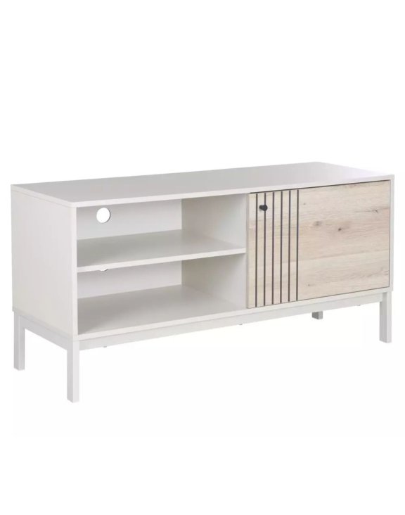 Wysoka funkcjonalność – 2 otwarte półki z otworami na przewody + 1 pojemna szafka z drzwiami.