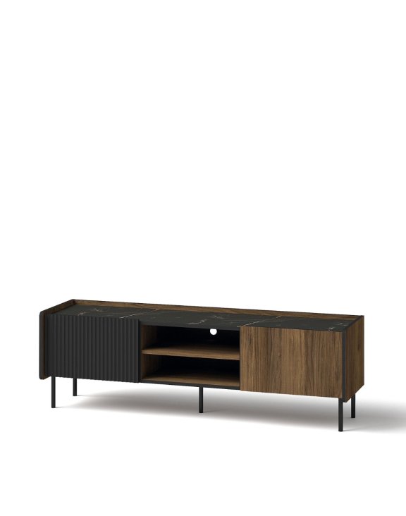 Połączenie ryflowanych frontów w kolorze czarny mat z płytą laminowaną w kolorze orzech warmia i blatu imitującego marmur nadaje kolekcji niepowtarzalny wygląd i oryginalność.