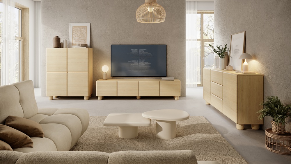 Szeroka komoda Lomo B 200 cm w dekorze dąb Vicenza. Minimalistyczna forma, zaokrąglone fronty i drewniane nogi tworzą elegancki mebel do salonu. Sprawdź i wprowadź naturalną harmonię do swojego wnętrza.